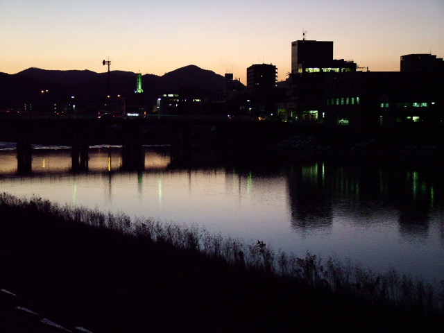 写真は土岐川のほとりから撮ったものです 左に見えるシルエットの橋が昭和橋です 土岐川はいつもこんな感じですが 台風後は今にも溢れるばかりになります それは見ると恐ろしい位です^^;