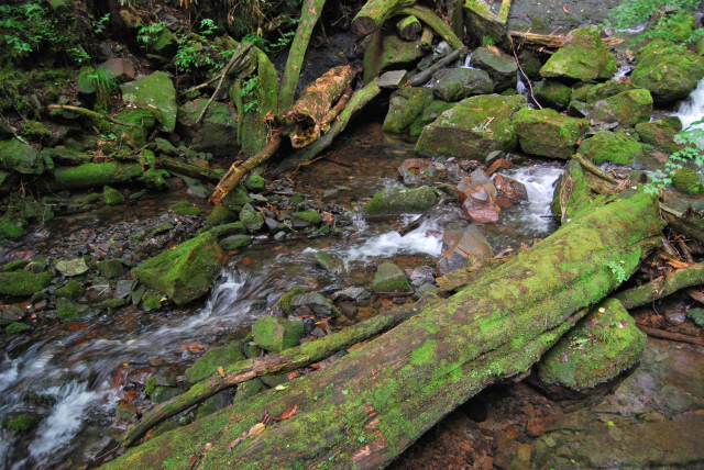 小川に倒れた木にも、苔が覆っている。