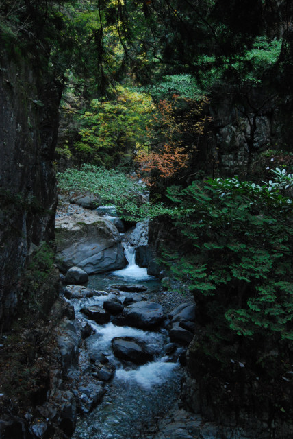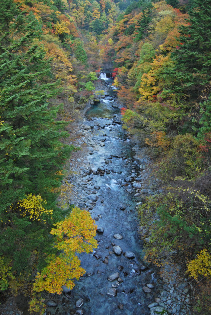 暫く歩き、観音滝に着いた・・・ぜんぜん紅葉が無い、前回撮ったのと同じ写真になってしまうのでボツ、そして不動滝・・・やはり紅葉が無い、一応撮ったが、撮る位置が限られるので前回と構図も同じになってしまいボツ、紅葉を撮りに来たのだから紅葉が欲しい。