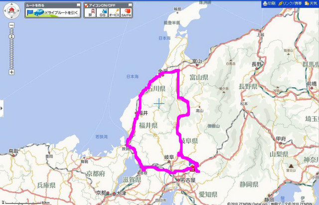 1枚目の写真のように、多治見ICから中央高速を通り、名神→北陸道→金沢から東海北陸道→東海環状で土岐南ICで降りるコースだ。