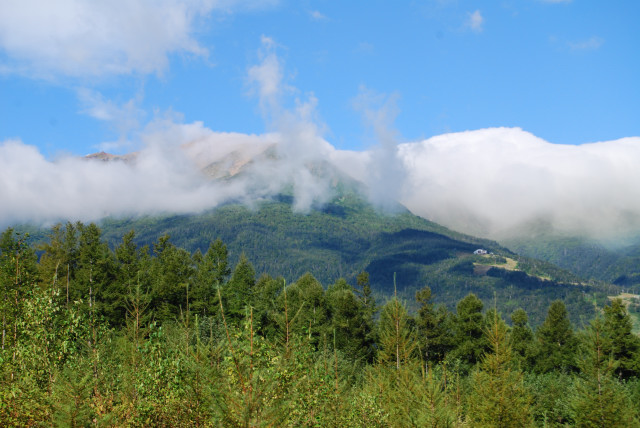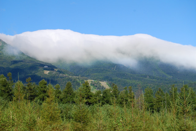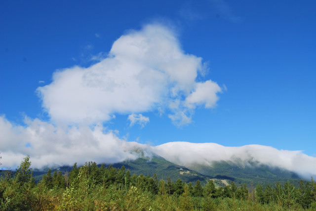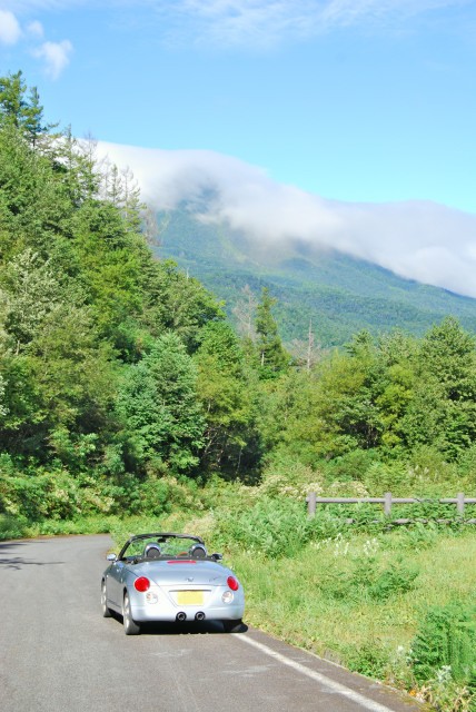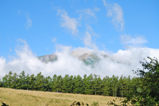 たっぷり森林浴を楽しみ、油木美林を後にして、今度は開田高原へ、途中御嶽山がよく見える場所があるので止まったが、写真の通り雲が掛かりまばらにしか見えない、だがこの雲も面白いので撮る。